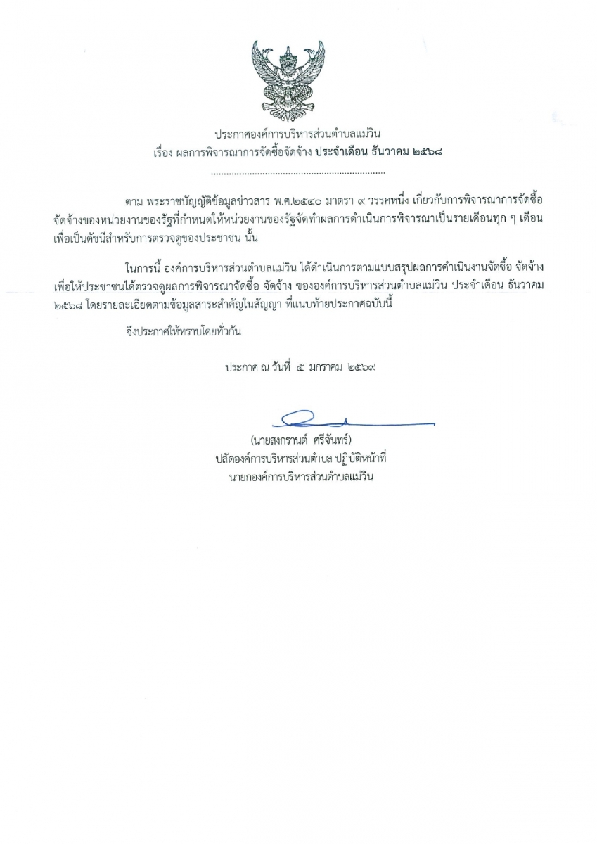 ผลการพิจารณาการจัดซื้อจัดจ้าง ประจำเดือนธันวาคม 2568