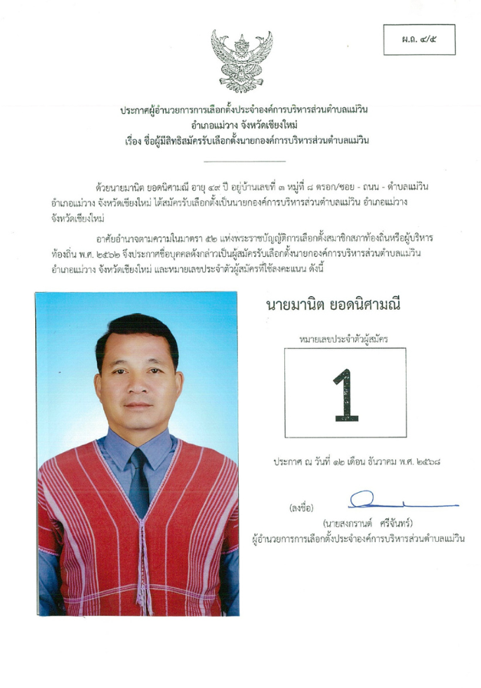 ประกาศบัญชีรายชื่อผู้สมัครรับเลือกตั้งนายก อบต.แม่วิน
