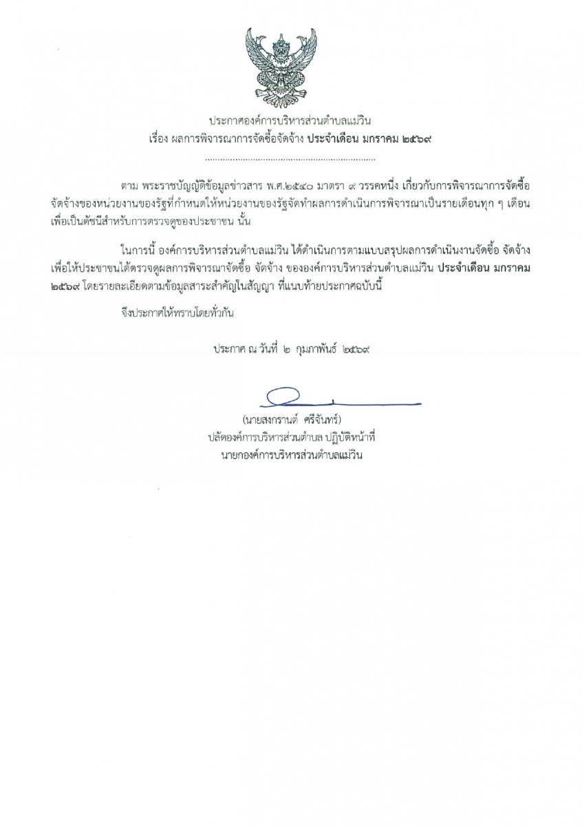 ผลการพิจารณาการจัดซื้อจัดจ้าง ประจำเดือนมกราคม พ.ศ.2569