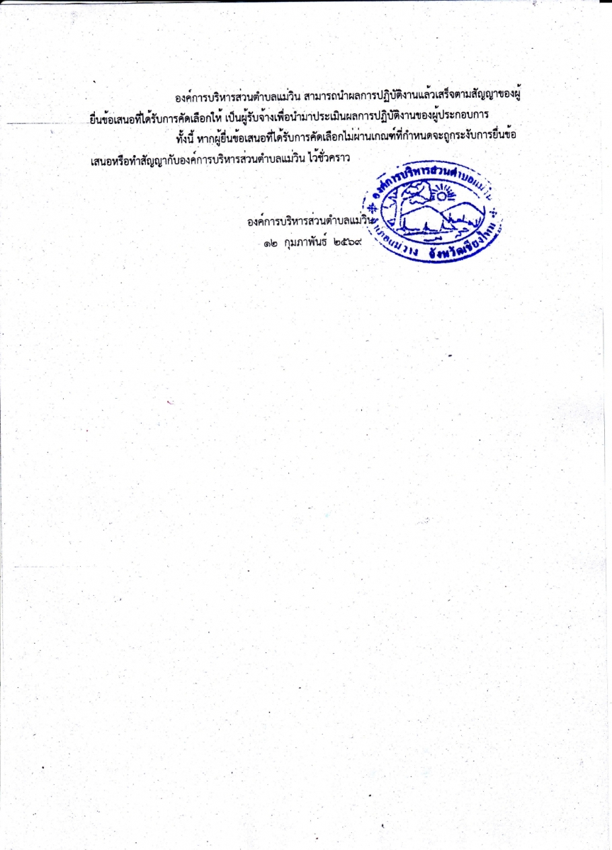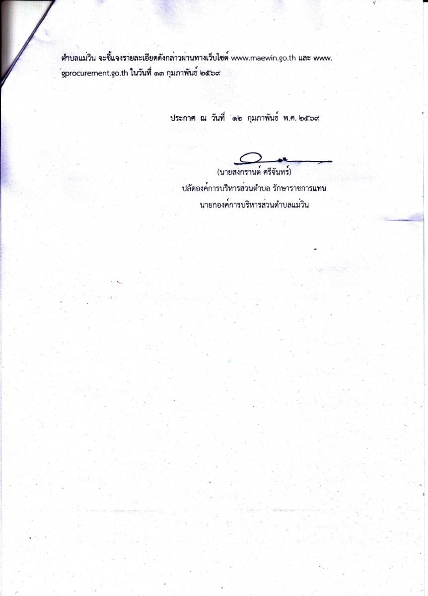 ประกาศองค์การบริหารส่วนตำบลแม่วิน เรื่องประกวดราคาจ้างก่อสร้าง ถนนคอนกรีตเสริมเหล็ก รหัสทางหลวงท้องถิ่น ชม.ถ.168-010 สายทางสบวิน-ขุนวิน หมูที่ 16 บ้านหนองมณฑา ตำบลแม่วิน อำเภอแม่วาง จังหวัดเชียงใหม่ ขนาดกว้าง 4.00 เมตร ยาว 2,000.00 เมตร หนา 0.15 เมตรหรือมีพื้นที่ไม่น้อยกว่า 8,000.00 ตารางเมตร ด้วยวิธีประกวดราคาอิเล็กทรอนิกส์ (e-bidding)