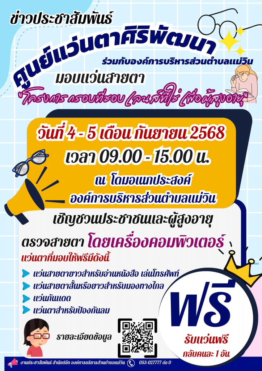 ศูนย์แว่นตาศิริพัฒนาร่วมกับองค์การบริหารส่วนตำบลแม่วินมอบแว่นสายตา "โครงการ กรอบที่ชอบ เลนส์ที่ใช่ เพื่อผู้สูงอายุ" วันที่ 4 - 5 เดือน กันยายน 2568 เวลา 09.00 - 15.00 น. ณ โดมอเนกประสงค์ องค์การบริหารส่วนตำบลแม่วิน เชิญชวนประชาชนและผู้สูงอายุตรวจสายตา โดยเครื่องคอมพิวเตอร์ แว่นตาที่มอบให้ฟรีมีดังนี้